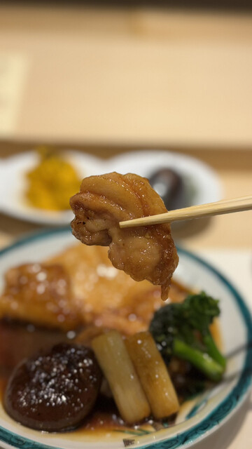 お造りはサーモンの昆布〆と鰤に昆布〆菜の花。昆布〆サーモンは燻製のようなまったりした食感と強めの旨味、鰤は脂の乗ったハラス部分の濃厚な旨味。そこに菜の花の昆布〆があっさりまとめるという味わいの変化が楽しめる組み合わせ。