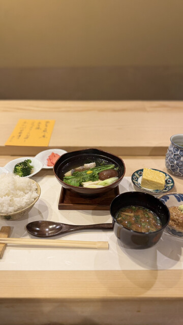 炊き立てツヤツヤなご飯、豆腐となめこの味噌汁。福菜には、松前漬けと茹で豚を和えたヤツを筆頭に、烏賊のネギ香味だれ、明太子しらたき入り煮、梅昆布煮、プチぷよトマト、紅芯大根ハリハリ漬け、と、どれも丁寧な仕事ぶりで、福菜だけでも和定食として成立しそうなボリューム感❗️