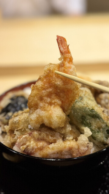 さっくり軽い衣に甘さ控えめで上品な丼タレ。肉厚な海老はぷりっと食感良く美味❗️野菜天、ゲソ天の他、鯵の大葉巻きかな?どれも風味良くボリューム満点
