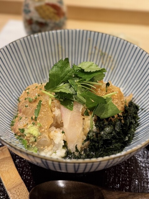 〆は鯛ご飯に岩海苔、三つ葉をのせてお出汁をたっぷりかけて鯛茶漬けに。お出汁をかけるとお出汁に加えて胡麻だれの風味もふわっと広がり思わず笑っちゃう美味さ‼️