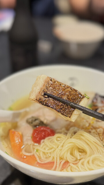 半生で仕上げた真鯛ミキュイは旨味も食感も抜群❗️ズワイガニも味わい豊か、大判のロースチャーシュー、ローストトマトもほどよい味のアクセントに。ゆっくり食べて温度が下がった後も食べはじめとは異なるスープのコクと旨味を感じられて大満足の逸杯❗️