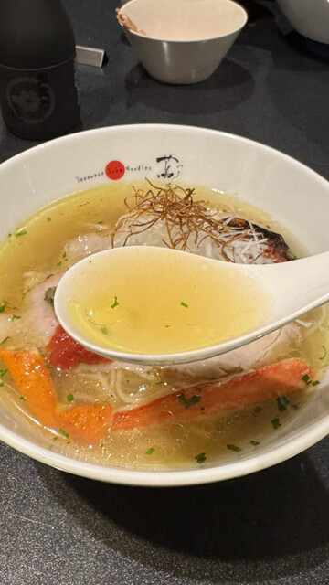 ここで登場、真打の塩Sobaは、地鶏、真鯛のWスープに浅蜊などの魚介を加えた塩ダレで仕上げた上質な旨味を湛えたスープにしなやかな中細ストレート麺。トッピングには、昆布〆真鯛のミキュイ、ズワイガニ、岩中豚ロースにはブラックオリーブを使ったタプナードとトマトソースで一口ごとに違った表情を見せる楽しいラーメン‼️