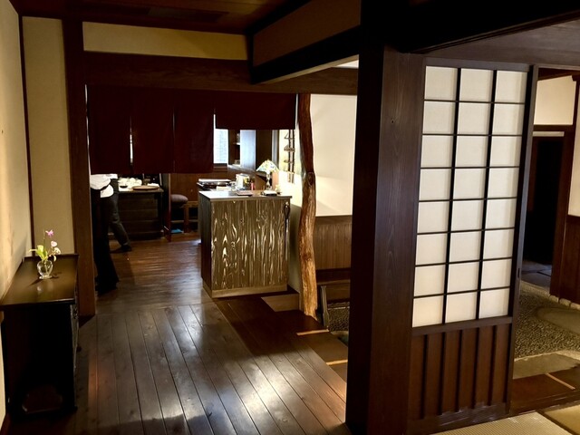 予約は午後1時、5分ぐらい前に到着し入店すると、すみませ〜ん、もうお蕎麦がなくなっちゃって〜との声が。1時に予約している旨を伝えると、は〜いと、個室に案内されました。お店は大きな古民家の造りで、テーブル席やカウンター席は少なく、ほとんどが座敷席(広間と個室)となります。店内の照明はちょっと暗くて、写真を上手く撮れるか心配になります。