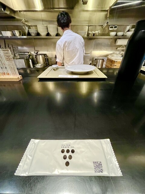 カウンター越しに鯛白湯をエスプーマいている所が見えます。