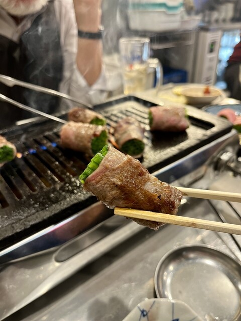 A5宮崎牛炙りユッケはバーナーで豪快に炙り、レバニラはガスコンロでぐつぐつボコボコ煮込んだり、そしてなんと言っても看板メニューのA5宮崎牛カルビネギ巻きのピラミッドがテンション上げ上げ