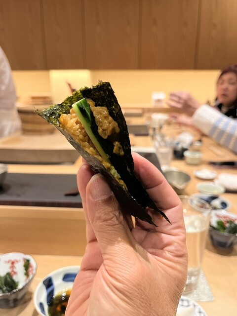 その後、鮑の肝と一緒に添えられた鮑や、サブメインと思われる、北陸のこの季節の味である香箱蟹と雲丹の手巻き寿司が出てきます。