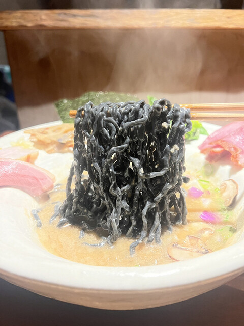 ★拉麺の麺は炭などを練り込んだ体が驚く自家製波動麺