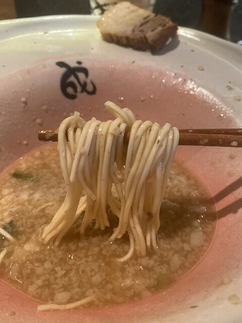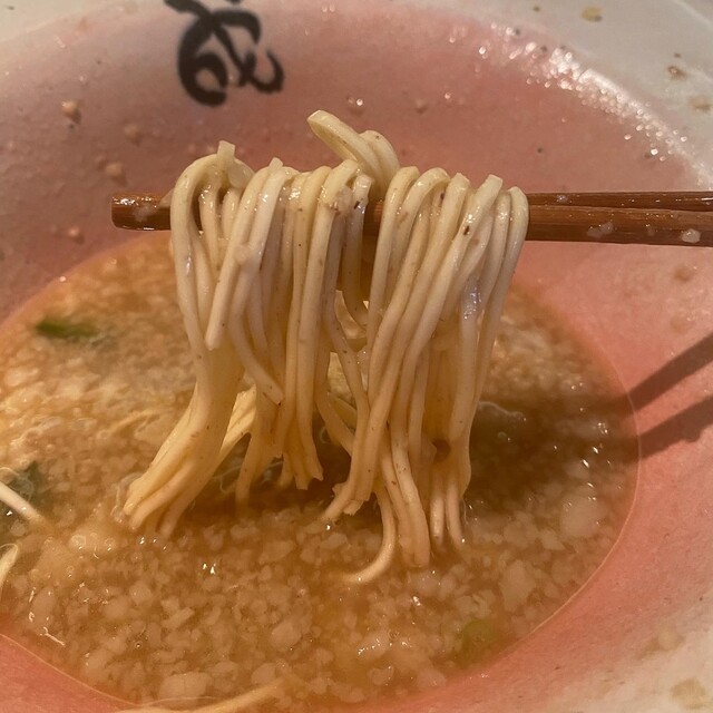 強烈に海老の香りがするスープは粘度は低くサラッとしながらも海老が堪能でき、大きめな背脂も入っているのでほんのり甘さも感じます。