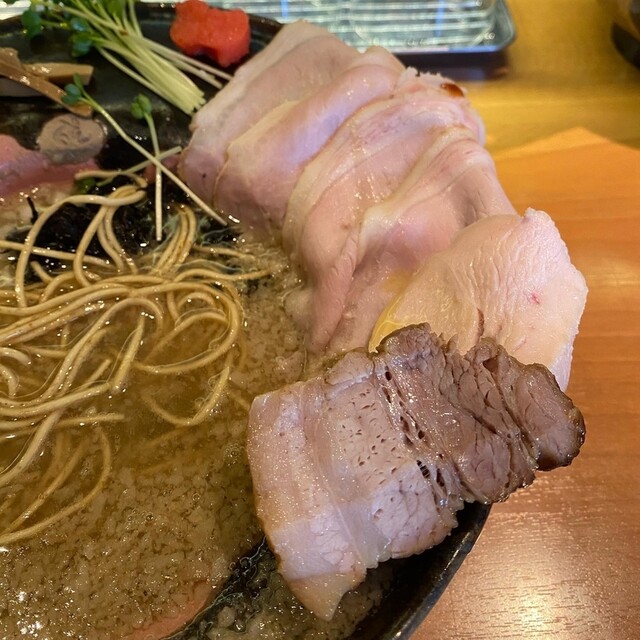 トッピングにはカイワレ、メンマ、3種のチャーシュー。前回くらいから吊るし豚の炙りが控えめになったなーとおもってたけど、今回ローストビーフ仲間入りした?と思って店主に聞いたら、なんの正体は豚とのこと。お肉の調理の仕方を変えたそうです。