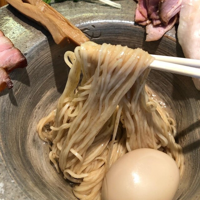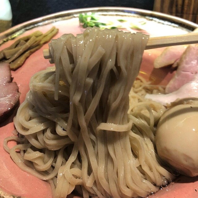 麺は驚愕の2種で細麺全粒粉ストレート平打ちは昆布水に浸けてあり、スルッといけるウマな麺。もう一方は極太の域を超えた一反木綿(ゲゲゲの鬼太郎)ばりのワイド感。弾力あってうウマな麺。