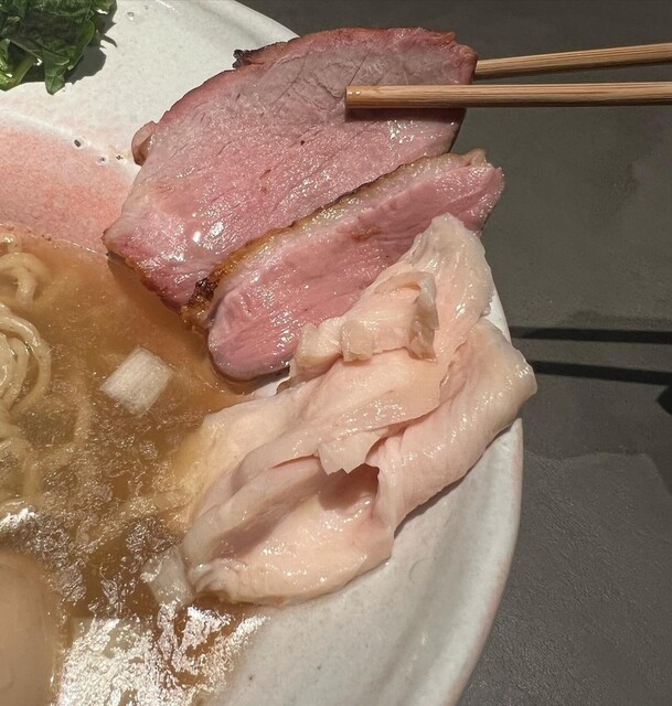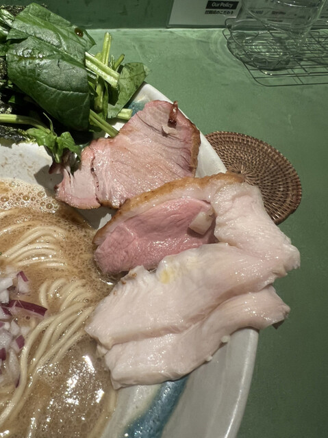 トッピングも秀逸で、鶏肉2種はそのまま食べても上質。煮豚はとろけるような柔らかさがあり、薄切りの肉も同様に美味。
