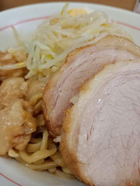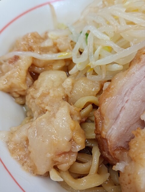麺は、以前の冷やし中華でも感動したワシワシとした食感の太麺。濃厚なつけ汁をしっかりと持ち上げ、噛み応えも抜群です。具材のブタは、いつものようにほろほろと柔らかく、味が濃く染み込んでいてジューシー。ヤサイ(もやし・キャベツ)のシャキシャキ感も良いアクセントです。