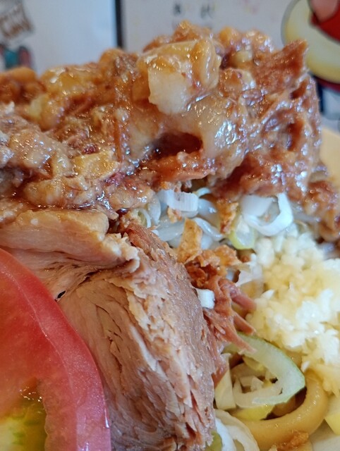 具材は、赤身と脂身のバランスが良いブタ。分厚くてもホロリと柔らかく、味もしっかり染みていて、これぞ二郎インスパイア系の極上チャーシューです。そして他店と比べると細めのモヤシを麺とつけ汁、ブタと一緒に口の中に入れるともう幸せでいっぱいになります。