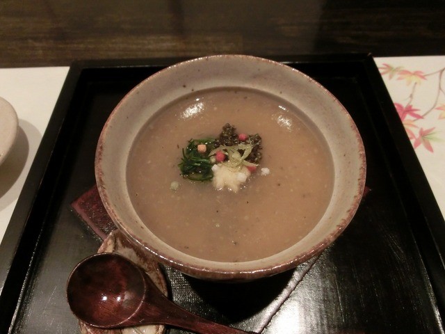 デザート:蓮根餅と粒あんに、抹茶ソースをかけたもの:甘味としては最高。抹茶ソースに秋と京都を感じることができた。