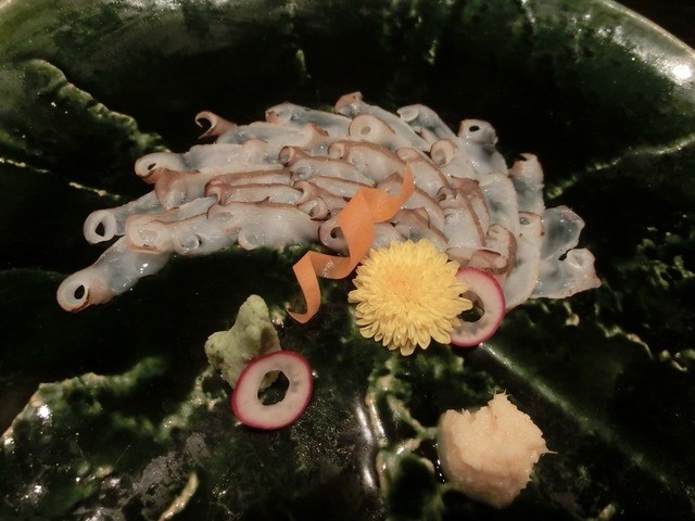 タコのお造り:タコを薄~く引いたものを、吸盤に合わせてきれいに並べてあります。菊やカブ、人参など、旬のもので美しい盛り付けに見惚れてしまします。