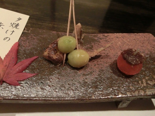 八寸:これまた美しい盛り付けです。サンマの焼き物や、白身魚のおかき揚げ、タコの軟らか煮などです。素材はよく分かりませんでしたけど、栗に模して造られた一品もあり、本当に魅せてくれます。