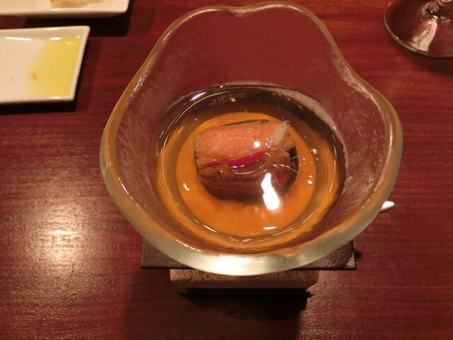 コーンのポタージュの上にズワイガニとウニをコンソメゼリー寄せを乗せたもの