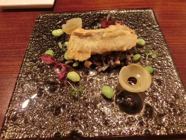 アナゴのフリット(枝豆、ワイルドライス添え)