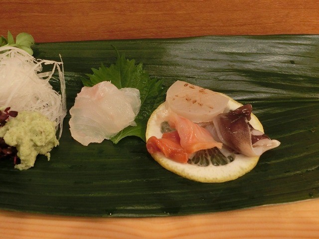 お造り(タイ、マグロ、ウニを巻いた水イカ、シマアジ)