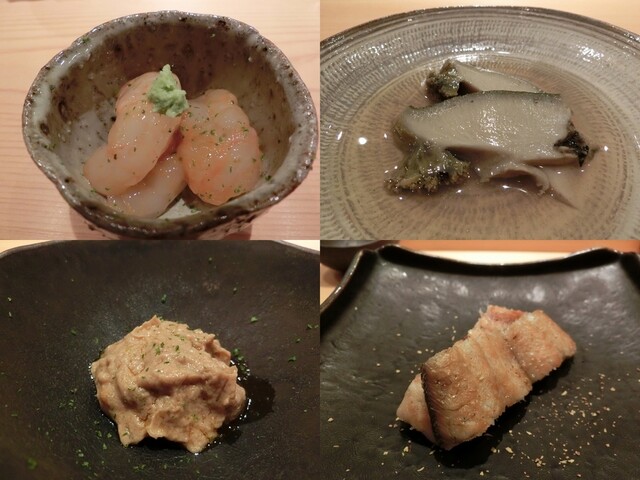 富山白海老、五島タコ、唐津クエと銚子の炙りイワシ、増毛ボタン海老と根室バフンウニ(これにシャリとイクラをオン)、噴火湾毛ガニと唐津赤ウニ、唐津蒸しアワビ、アワビの肝の溜まり漬け、博多湾鰻の白焼き