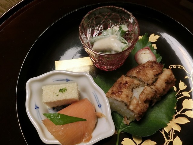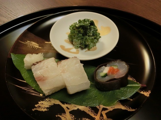 鱧寿司、鱧の子ゼリー寄せ、インゲン豆の胡麻和え、さつき鱒のスモーク