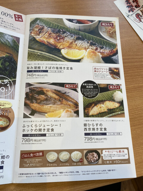 「さばの味噌煮」や「真鱈の黒酢あん」や「ホッケ」や「銀ひらすの西京焼き」なんかもありますが、やっぱりド定番の「さばの塩焼き定食748円(税抜)」と「アジフライ定食798円」に決定。