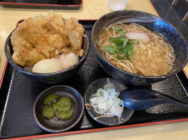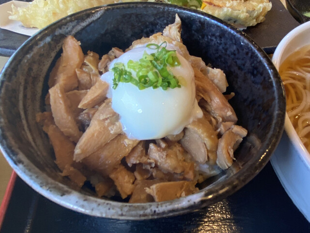 カミさんはランチの「かしわ天丼セット(温かい花そば)」。