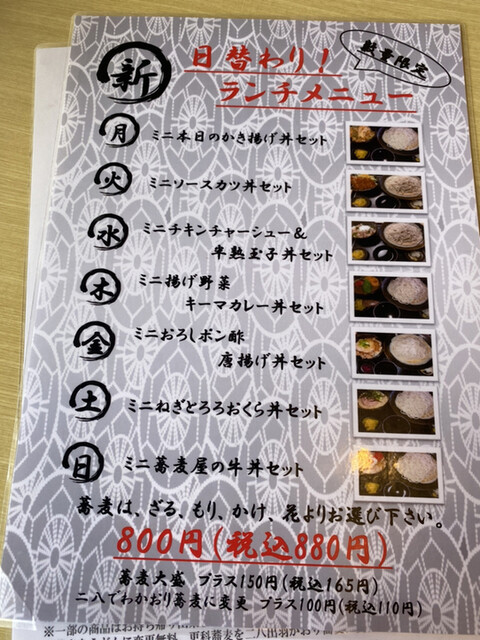 もひとつは「カレー南蛮そ蕎麦850円」に「揚げたてサクサク天丼ミニ450円」を追加しました。