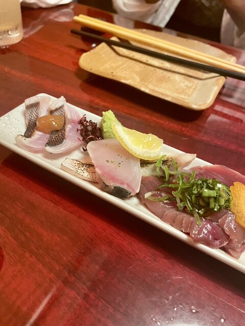 刺身3点盛り。炙り鰤は脂がトロトロ。こんがり炙った皮目の香ばしさもちょうどいい。鰤というよりステーキ食べてる感じ。甘い帆立はレモンと塩で。柚子のアクセントが爽やか。鯵も新鮮で美味しかった。
