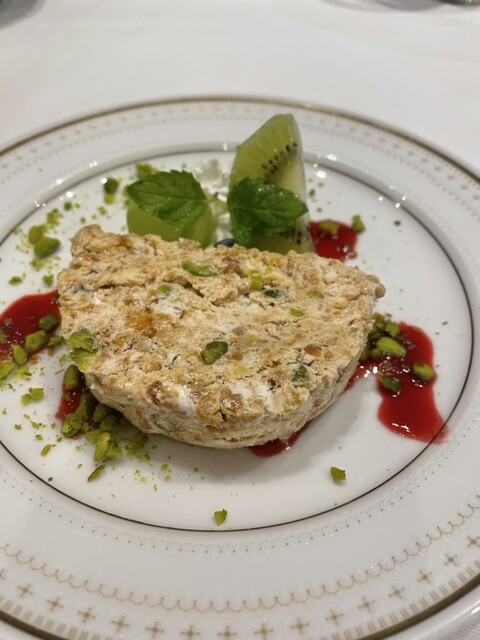 ピスタチオとナッツのヌガーグラッセ。甘すぎず意外にさっぱり。きなこのような香ばしさが、日本人好みな味わい