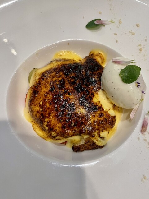 いつもながら、どの料理も凝っていて、五感で味わえる個性派ぞろい。毎回楽しみにしているスープドポワソンが、リーヌ風と冠してさらに進化を遂げていた!私的、本日のナンバーワン。滑らかでクリアに研ぎ澄まされた魚介の旨み。鼻腔の奥で色んな表情を見せてくれる一筋縄ではいかないスープなのでした…!
