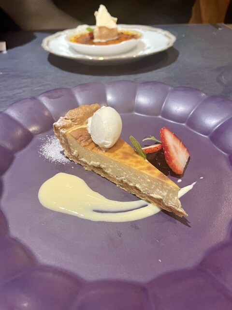 バスク風チーズケーキ。パッションフルーツのムースが添えられている。