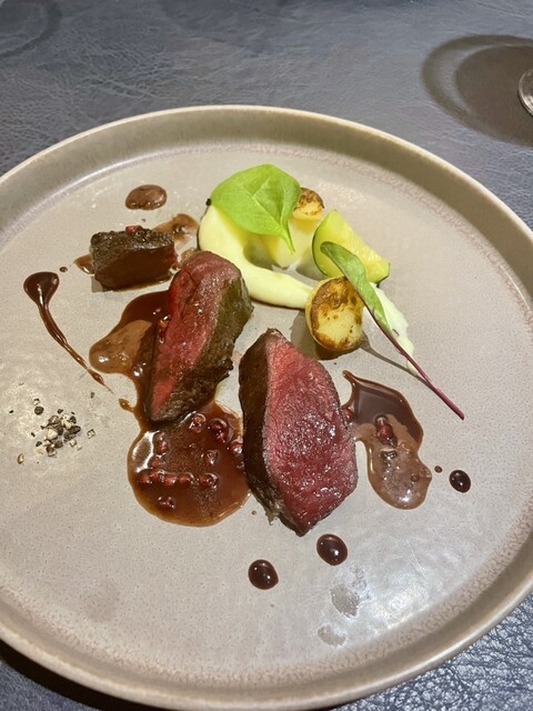 本州鹿もも肉。低温調理だからしっとり、うまみ凝縮。全く臭みはない。ベリーソースの野性っぽさも相まって、森の生きものを感じる一皿に。