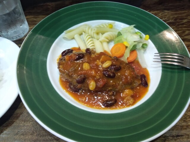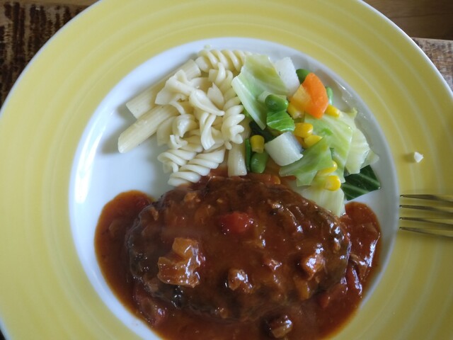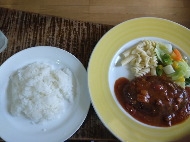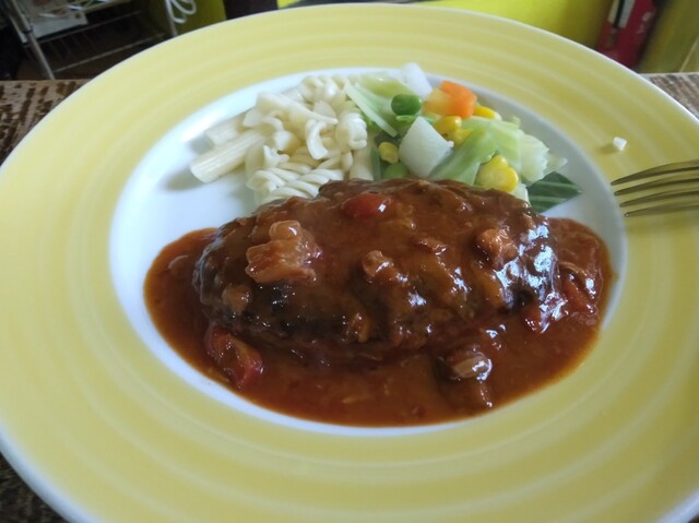 肉質がやわらかくソースの濃さも濃すぎることもなく、この味のないマカロニをハンバーグのソースで食べることもおいしい。
