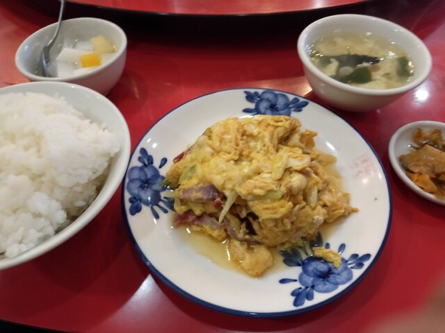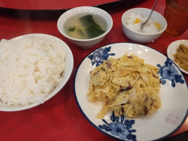 rice、卵とチャーシューの炒めもの、メンマ、ワカメと卵のスープ、杏仁豆腐という集合体。