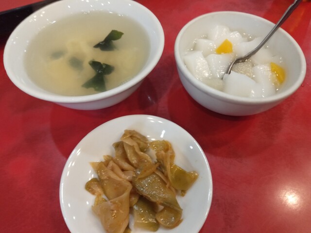 溶き卵がたっぷり入ったワカメスープ、メンマ、デザートの杏仁豆腐というコンビネーション。