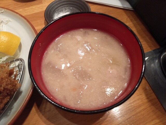 白い味噌の豚汁も、大根、人参、豚肉といった具も軟らかく煮こまれて、切り方も丁度良い一口サイズになって、とんかつとも連続性がよい。