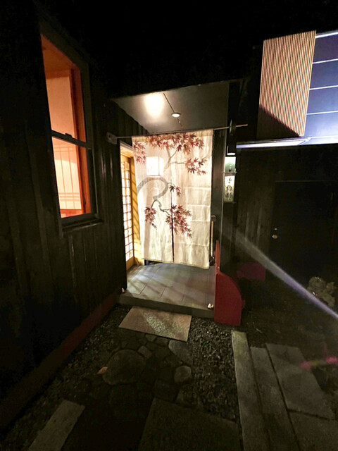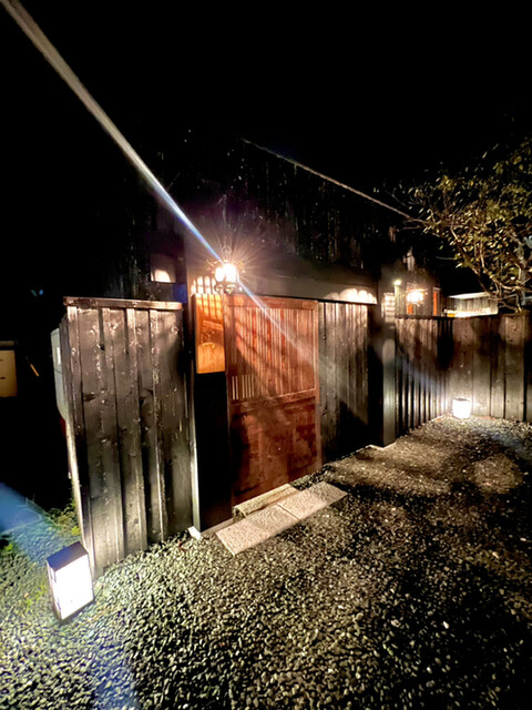 周囲には住宅が立ち並ぶ落ち着いたエリアで、建物は深い焦げ茶の木材を基調にしており、照明の当たり方で表情が変わります。夜に訪問すると、アプローチの照明が控えめに店構えを照らし、まるで料亭のような静謐さと緊張感のある美しさを感じます。
