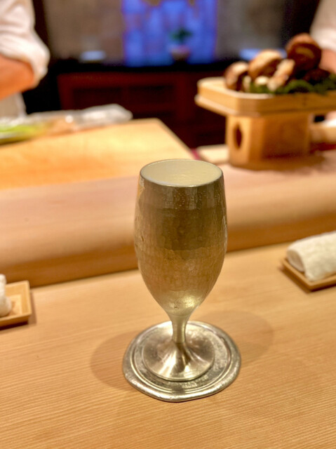 「SHINNIHON RYORI OBUNE」の文字が刻印された錫のグラスで提供されます。ビールは錫の器で飲むとより美味しく感じるんですよね。