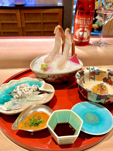 活き越前蟹・・・捌く前に生きた越前蟹を見せてくれます。コイン型の黄色い証明タグでオスの越前蟹であることが分かります。刺身を巣立と岩塩の塩わさびでいただくと、トロッとした食感と同時に脂の乗った甘味ある美味しさが広がります。最高です(涙)。