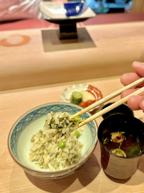 炊き込みご飯・・・鯛と浜名湖新青海苔、グリーンピースの炊き込みご飯で、炊き上がりの土鍋を見せてくれると、青海苔に埋もれた鯛がこちらをみているかのように感じます。鯛の旨味を青海苔の香りをまとって炊き上がったご飯は絶品。ただ、この頃にはお腹いっぱい過ぎて完食できず、もの凄く悔しい思いをしました。