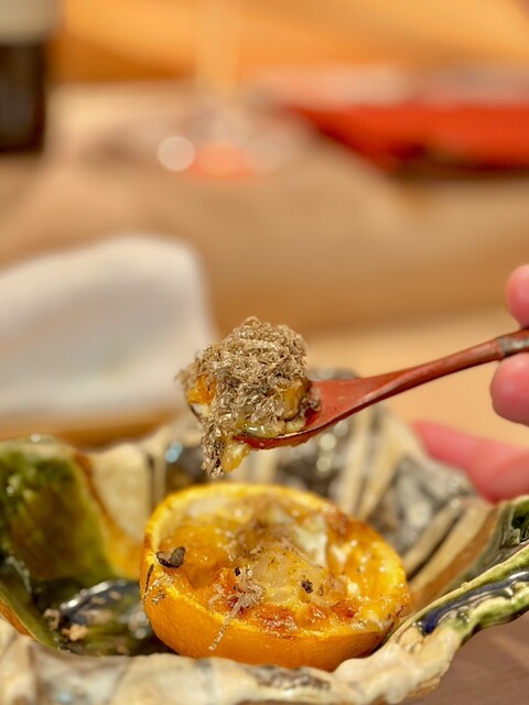 柚子釜のトリュフ味噌焼き・・・柚子の器をそのまま使った一皿で、熱が入ることでまず皮からふわりと立ちのぼる芳香が心を掴みます。中には帆立の瑞々しい甘み、クリームチーズのまろやかさ、味噌の塩味、柚子果実のほのかな酸味が溶け合い、仕上げにかけたトリュフにより、香り・甘み・コク・酸味が層を成すように広がります。
