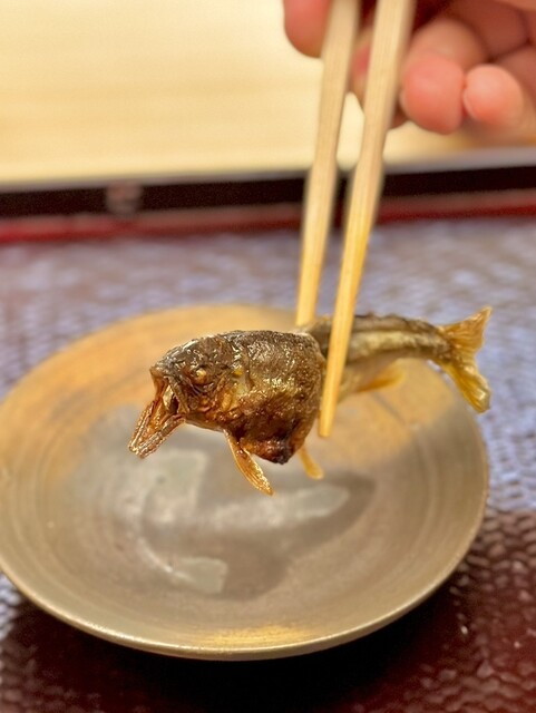 鮎の炭火焼・・・長野県天竜川の鮎をお尻を上げて焼くことで、鮎の持っている脂が頭にとどまるようにし、頭は唐揚げ状態、お腹は塩焼き、お尻は千物のように3口で食感の違いを楽しむ一品。