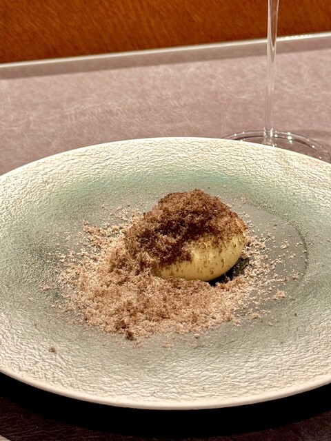黒雪・・・ここでデザートの一品目。アイスクリームに黒い宝石、凍らせたトリュフを削りおろして振りかけた一品。温かい料理に使うトリュフは、常温から高い温度の料理に乗せることで温度変化で香りが舞い上がるという性質から、冷凍された状態から口の中で急激に温められたトリュフに同じ効果が生じるというもの。