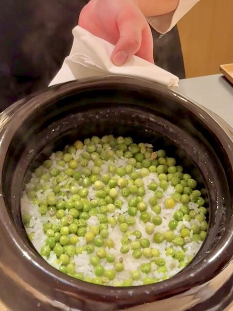 うすい豆の土鍋御飯・・・見た目はグリーンピースに見えますが、粒が大きく甘味が強いうすい豆と一緒に岐阜のお米「龍の瞳」を炊いたもの。