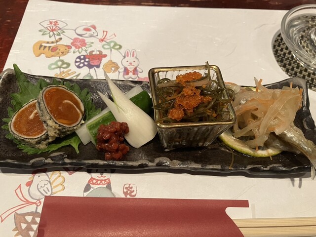 奥かられんこんきんぴら、鯵南蛮、砂肝マスタード、出汁巻き