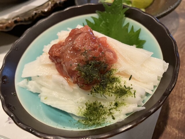 お通し。生酢の大根は大将がサクサク包丁入れておられる。お通しのほんの一部でこの手の込みよう!