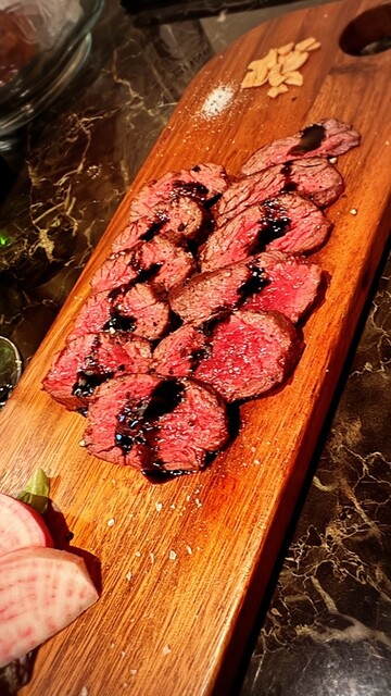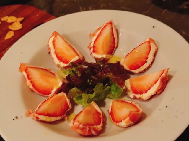 久しぶりの訪問。ずっと行きたくて前回9月に来たら休みだったんで半年以上ぶりに訪問。今度はちゃんと電話予約して開いてるの確認。ここの料理は何頼んでも美味しいし、何よりマスターと奥様?の人柄に惹かれちゃう程本当に気持ちの良い方でまた女性スタッフのおふた方も気さくで楽しく毎回来るのが楽しみなお気に入りのお店です。相方が来るまでカチョカバロとブルーチーズと蜂蜜のピザを甘めの白ワインで。美味いなぁ、ピザ最高!止まらなくなるからあっという間に無くなってしまいもう先に牛ハラミのグリルを。トリュフ塩で食べると美味しいですよとマスターから説明ありガーリックフライと別にすると美味しい。もうお酒進みまくるので相方来る前にボトル頼んで進むくん!ほんと美味いなぁ相方きたんで先に注文してたイチゴとクリームチーズの生ハム包みと牡蠣のアヒージョを。このお店に来たらイチヂクとイチゴのクリームチーズの生ハム包みは絶対外せない!牡蠣もプリプリでマジうま!やっぱここ最高です!また来年もきますね!生もみじお土産にwww