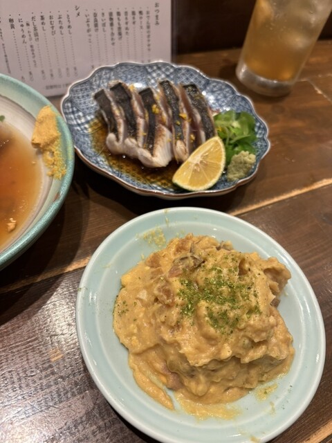 アテは、定番ポテサラと本日オススメの鰆の炙りお刺身を。鰆、なんともいえないお味で美味しかったぁー。見た感じから、美味しさが滴るのか、お隣さんに質問されちゃいました