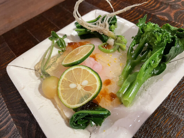刺身と厳選された野菜を和えたサラダ仕立て。。。※魚と野菜の種類を失念